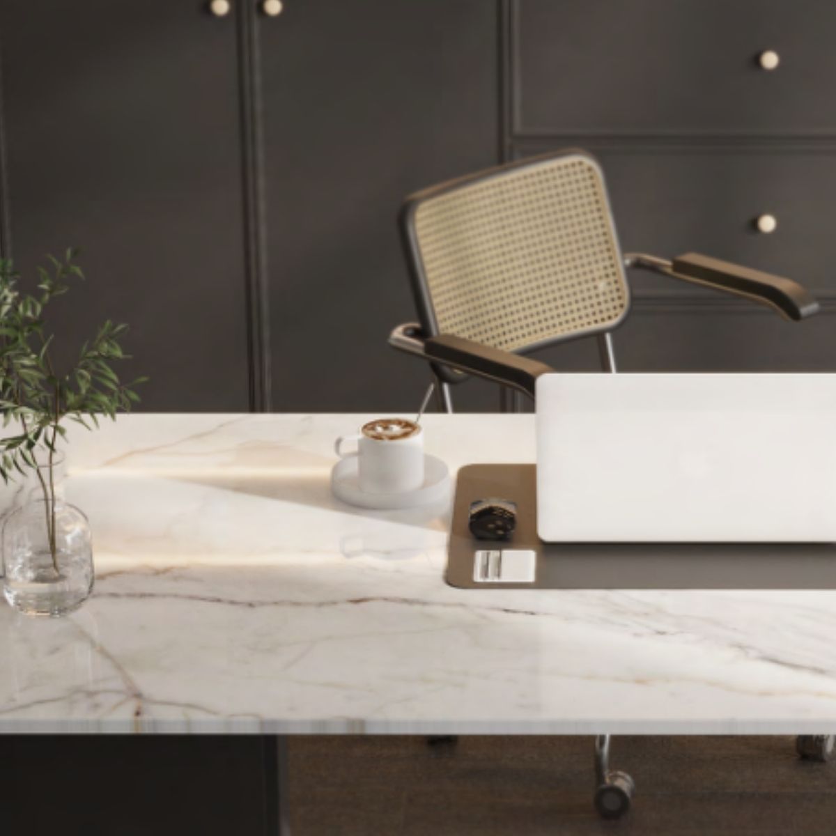 Calacatta Royale Vasta Stone gây ấn tượng với nền trắng thanh lịch và hệ vân xám mềm như mây, phù hợp ốp bếp, lavabo, bàn ăn, sảnh và cầu thang theo phong cách hiện đại – sang trọng.