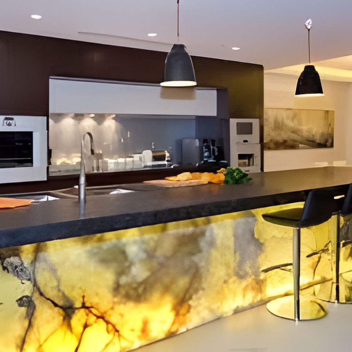 Đá Onyx mang đến một quầy bar nổi bật, tạo điểm nhấn mạnh mẽ cho không gian phòng khách hoặc sảnh lớn.